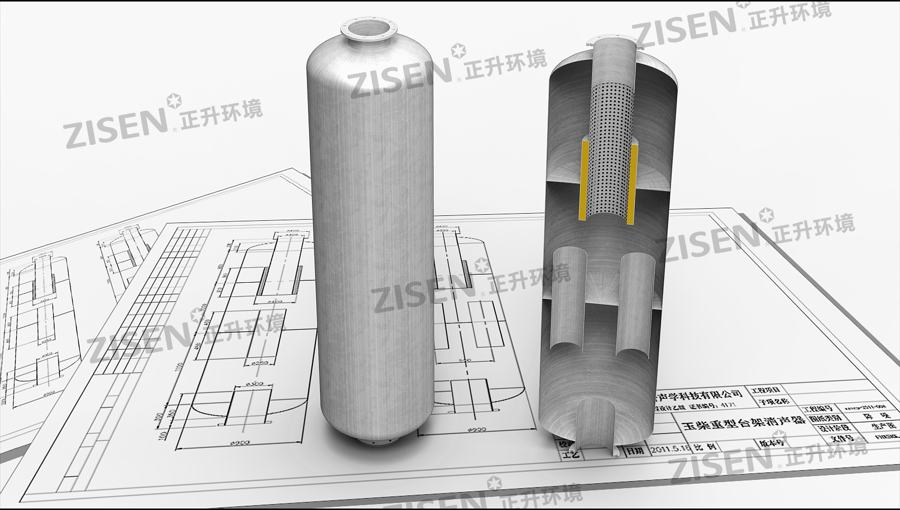 ?式消聲器為單?消聲?累加排列組合?成,?式消聲器由兩端封頭加中間吸聲體組成。吸聲體為?堿玻纖布包裹吸聲材料,護(hù)?為穿孔板。